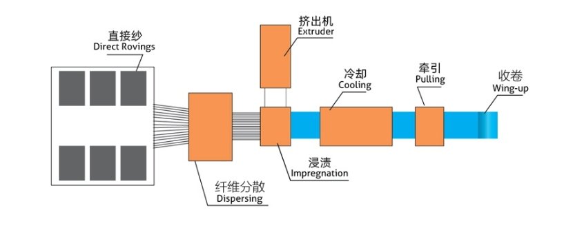A molten mixture of polymer resin and additives is obtained through anextruder. The continuous filament roving is dispersed and impregnatedby pulling through the molten mixture. After cooling, curing and coiling.the final material is formed.