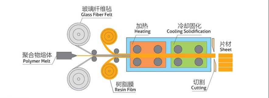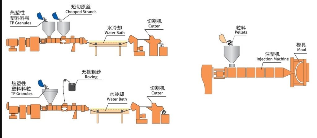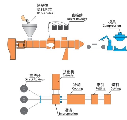 Polymer pellets and glass roving are all introduced into a twin-screw extruder where the polymer is melted and compoundis formed, Then the molten compound is directly molded into the final parts by injection or compression molding process.